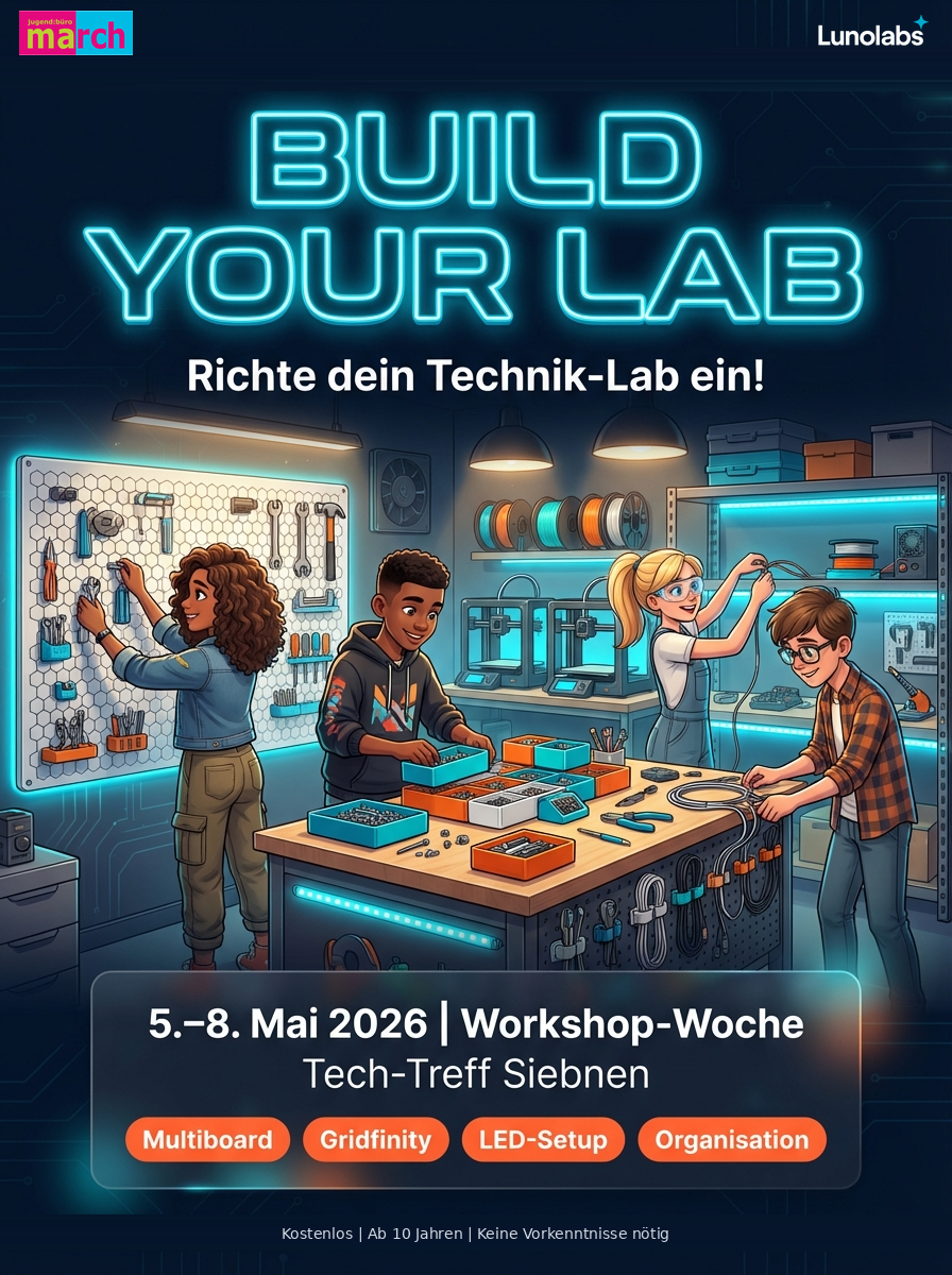 Die Workshop-Woche trägt den Namen «Build Your Lab». Am Montag ist der Raum noch fast leer. Werkbänke, Multiboards, Infinity Grids, LED-Streifen und Kisten voller Material warten auf ihren Platz. Schritt für Schritt hängen die Jugendlichen Werkzeug auf, sortieren Bauteile und nehmen die 3D-Drucker in Betrieb. Jeden Tag druckt eine der Maschinen etwas Neues. Ein Halterungssystem für Schraubenzieher, ein Label für die Werkzeugkiste, ein Ersatzteil für den Drucker selbst.